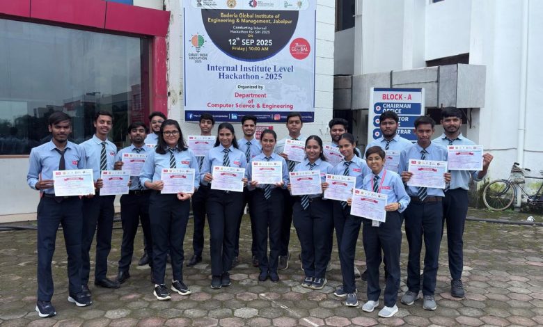 जबलपुर।बड़ेरिया ग्लोबल इंस्टिट्यूट ऑफ इंजीनियरिंग एंड मैनेजमेंट, जबलपुर के तत्वावधान में एक दिवसीय आंतरिक हैकथॉन 2025 का सफलतापूर्वक आयोजन किया गया। इस प्रतियोगिता में सीएसई, आईटी, एआई/एमएल, डीएस, आईओटी एवं ईसी विभाग की लगभग 80 टीमों ने भागीदारी कर अपनी प्रतिभा का प्रदर्शन किया।