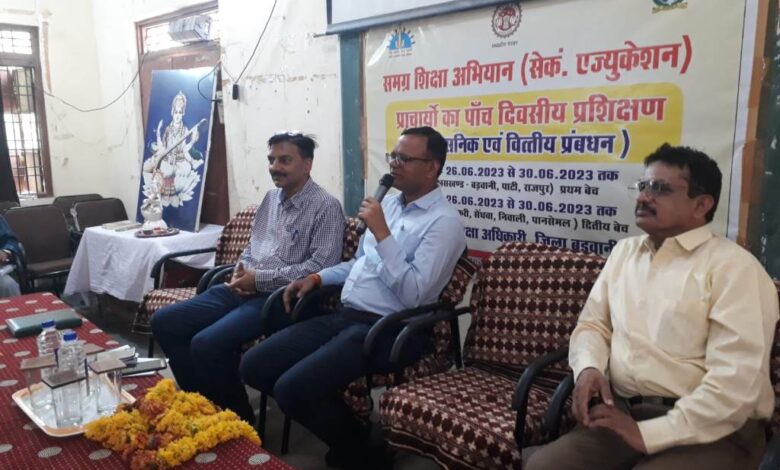 इससे पूर्व जिला शिक्षा अधिकारी श्री महेश कुमार निहाले द्वारा 5 दिवसीय प्राचार्य प्रशिक्षण की रूपरेखा से अवगत कराकर जानकारी प्रदान की गई। सहायक आयुक्त श्री नीलेश रघुवंशी द्वारा बिंदुवार शैक्षणिक गुणवत्ता सुधार हेतु प्राचार्य को टिप्स दिये गये। इस दौरान कलेक्टर ने पर्यावरण मंत्रालय भारत सरकार, राष्ट्रीय हरित कोर मिशन, पर्यावरण नियोजन एवं संस्थान भोपाल (एफ्को) द्वारा इको क्लब हेतु प्राप्त कीट, राष्ट्रीय हिंदी ग्रंथ अकादमी द्वारा प्राप्त पुस्तकों के सेट पुस्तकालय हेतु व आगामी 27 जुलाई को होने वाले पर्यटन क्विज के पोस्टर का वितरण प्राचार्यो को किया गया।