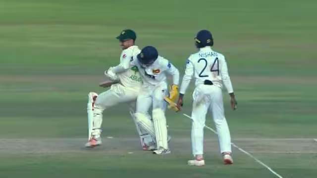 टेस्ट मैच के पहले दिन के तीसरे सेशन में सदीरा समरविक्रमा और अबरार अहमद के बीच हास्यास्पद वाकया हुआ। पाकिस्तान की पारी के 120वें ओवर की अंतिम गेंद पर मेंडिस ने ऑफ स्टंप के बाहर एक गेंद फेंकी और गेंद तेजी से घूम गई। 11वें नंबर पर बल्लेबाजी करने उतरे अबरार के ग्लव्स से गेंद लगने के बाद उनके पैड के अंदर पहुंच गई। विकेटकीपर ने गेंद को लेना चाहा लेकिन अबरार उनसे भागते नजर आए।