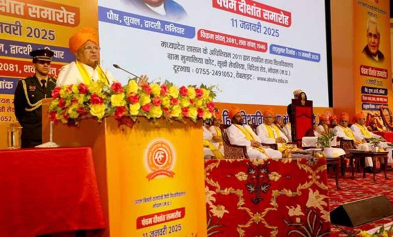 राज्यपाल श्री मंगुभाई पटेल ने कहा है कि ज्ञानवान होना ही पर्याप्त नहीं है, ज्ञान को आचरण में उतारना भी जरूरी है। भारत रत्न अटल बिहारी वाजपेयी जैसे महान कवि, लेखक और राष्ट्रभक्त की स्मृति में स्थापित विश्वविद्यालय के छात्र-छात्राओं का दायित्व है कि वह देश, समाज, समुदाय,परिवार और वंचितों के प्रति संवेदनशील रहें। राज्यपाल श्री पटेल शनिवार को कुशाभाऊ ठाकरे अंतर्राष्ट्रीय कन्वेंशन सेंटर हॉल में आयोजित अटल बिहारी वाजपेयी हिन्दी विश्वविद्यालय के पांचवें दीक्षांत समारोह में उपस्थित अतिथियों और विद्यार्थियों को संबोधित कर रहे थे।