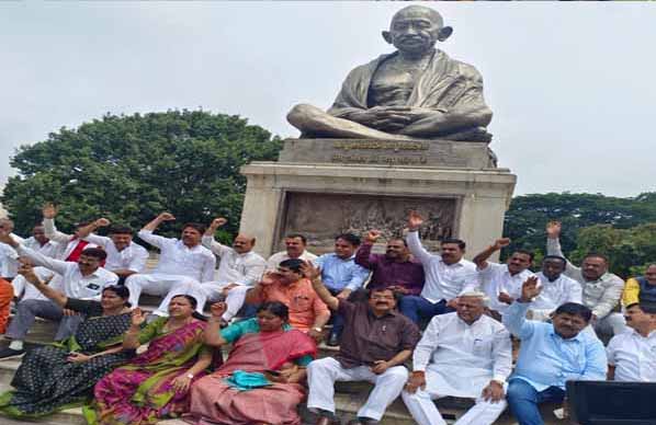 पूर्व मुख्यमंत्री बसवराज बोम्मई की अध्यक्षता में हुए विरोध प्रदर्शन में भाजपा विधायक और एमएलसी ने भाग लिया और सरकार के खिलाफ नारे लगाए।