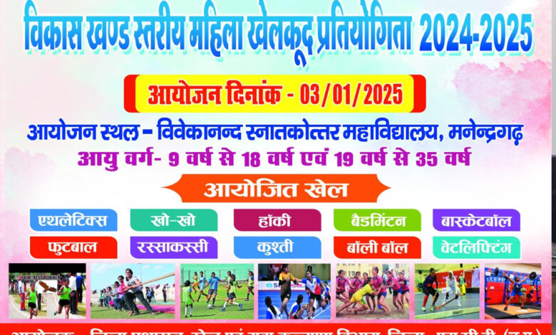 कलेक्टर डी. राहुल वेंकट और खेल अधिकारी गोपाल सिंह के निर्देशानुसार मनेंद्रगढ़ के शासकीय विवेकानंद स्नातकोत्तर महाविद्यालय के खेल प्रांगण में विकासखंड और जिला स्तर पर बालिका/महिला खेलकूद प्रतियोगिता का आयोजन किया जाएगा। विकासखंड स्तर की प्रतियोगिता 03 जनवरी 2025 को तथा जिला स्तर की प्रतियोगिता 04 जनवरी 2025 को आयोजित होगी। प्रतियोगिता में खो-खो, फुटबॉल, बास्केटबॉल, वॉलीबॉल, वेटलिफ्टिंग, रस्सा-कस्सी, हॉकी, कुश्ती, बैडमिंटन और एथलेटिक्स जैसे खेलों की स्पर्धाऐं आयोजित की जाएंगी।