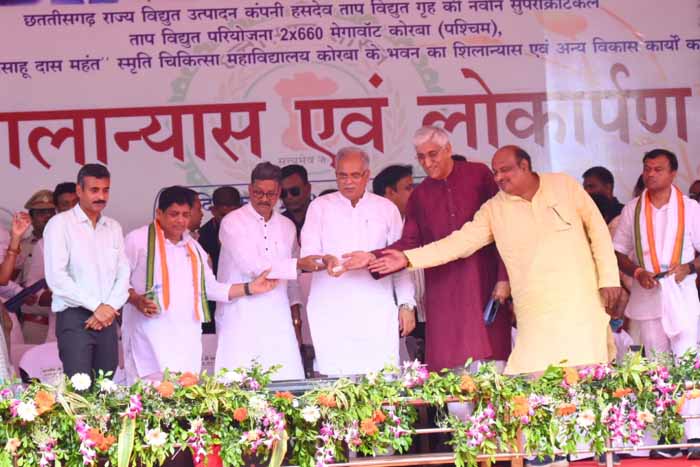 मुख्यमंत्री श्री भूपेश बघेल ने आज कोरबा जिले के एक दिवसीय प्रवास के दौरान कोरबा के घण्टाघर मैदान में आयोजित कार्यक्रम में विभिन्न कार्यों का शिलान्यास और लोकार्पण और भूमिपूजन किया। इस अवसर पर मुख्यमंत्री ने छत्तीसगढ़ राज्य विद्युत उत्पादन कंपनी हसदेव ताप विद्युत गृह की नवीन सुपरक्रिटिकल ताप विद्युत परियोजना कोरबा (पश्चिम) का शिलान्यास किया। इसकी अनुमानित लागत 12 हजार 915 करोड़ रूपए है। श्री बघेल ने विभिन्न विभागों के अंतर्गत किए जा रहे 72 विकास कार्यों का भी लोकार्पण, भूमिपूजन और शिलान्यास किया जिसकी लागत 112 करोड़ 13 लाख से भी अधिक है। इन कार्यों में 54 करोड़ 70 लाख राशि के 38 विकास कार्यों का लोकार्पण एवं 57 करोड़ 43 लाख से अधिक राशि के 34 विकास कार्यों का शिलान्यास कार्य शामिल हैं। मुख्यमंत्री ने यहां कलेक्टरेट परिसर में छत्तीसगढ़ महतारी की मूर्ति का अनावरण एवं डिंगापुर में नवनिर्मित ई-लाईब्रेरी का लोकार्पण किया।