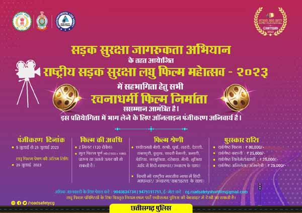 छत्तीसगढ़ पुलिस द्वारा सड़क सुरक्षा अभियान चलाया जा रहा है। इसके अंतर्गत अब लघु फिल्मों के जरिए भी जन जागरूकता के प्रयास किए जाएंगे। इसके लिए प्रदेश के रचनाधर्मी लोगों को सड़क सुरक्षा पर लघु फिल्म बनाने के लिए प्रेरित करते हुए राष्ट्रीय सड़क सुरक्षा लघु फिल्म महोत्सव 2023 के अंतर्गत प्रविष्टियां आमंत्रित की गई हैं। इन लघु फिल्मों को अलग-अलग केटेगरी में राज्य सरकार द्वारा पुरस्कृत किया जाएगा। प्रतियोगिता में भाग लेने के लिए आॅनलाइन पंजीयन 5 जुलाई से शुरू हो चुका है। अंतिम तिथि 26 जुलाई 2023 निर्धारित है।