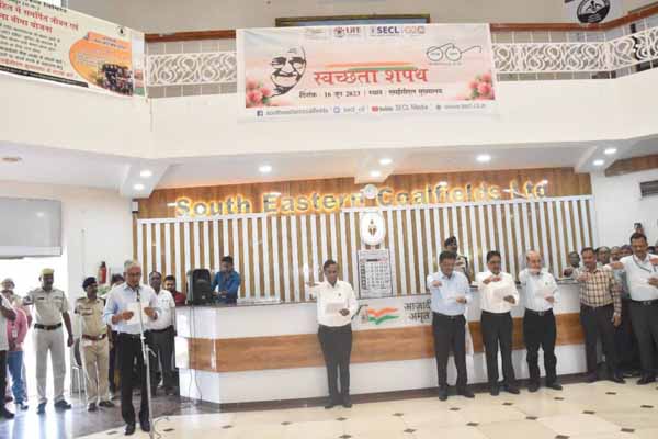 भारत सरकार के स्वच्छ भारत मिशन के अंतर्गत एसईसीएल में स्वच्छता पखवाड़ा 2023 का शुभारंभ स्वच्छता शपथ कार्यक्रम के आयोजन के साथ हुआ। एसईसीएल मुख्यालय बिलासपुर के प्रशासनिक भवन में आयोजित कार्यक्रम में अध्यक्ष-सह-प्रबंध निदेशक डॉ. प्रेम सागर मिश्रा ने निदेशक मण्डल, विभिन्न विभागाध्यक्षों, अधिकारियों-कर्मचारियों, श्रमसंघ प्रतिनिधियों की उपस्थिति में समस्त उपस्थितों को स्वच्छता शपथ दिलाई।
