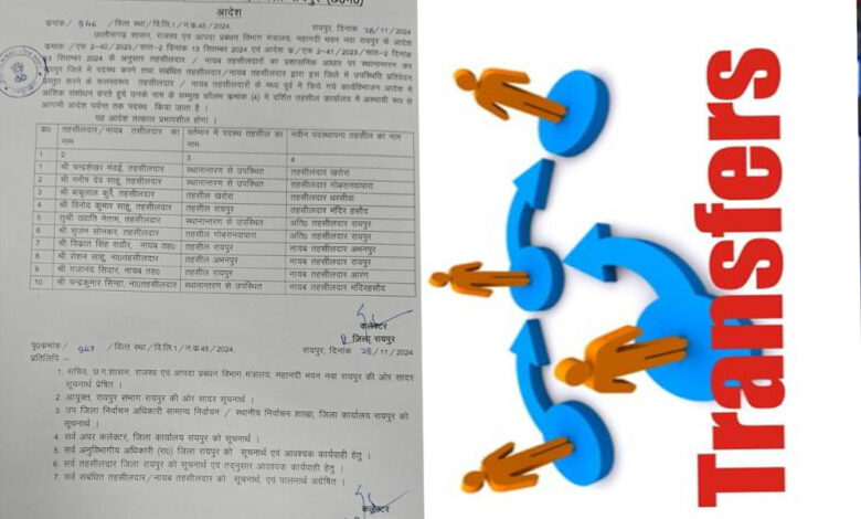 रायपुर कलेक्टर गौरव सिंह ने जिले में पदस्थ कई तहसीलदार और नायब तहसीलदारों का तबादला आदेश जारी किया गया है. कलेक्टर की तरफ से जारी आदेश के मुताबिक 6 तहसीलदार और 4 नायब तहसीलदारों के प्रभार में फेरबदल किया गया है.