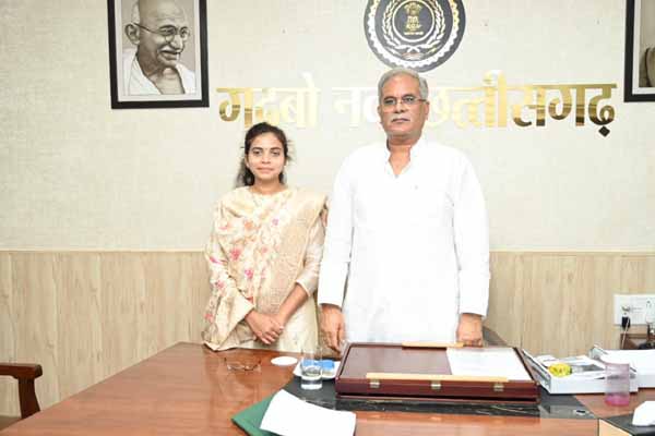 मुख्यमंत्री श्री भूपेश बघेल से छत्तीसगढ़ राज्यगीत के रचयिता डॉ. नरेंद्र देव वर्मा पर शोध करने वाली शोधार्थी सुश्री चंदन बाला ने सौजन्य मुलाकात की । सुश्री बाला ने मुख्यमंत्री को बताया कि वह डॉ. नरेंद्र देव वर्मा पर शोध करने वाली पहली शोधार्थी हैं । मुख्यमंत्री ने सुश्री बाला को बधाई एवं शुभकामनाएं दी ।