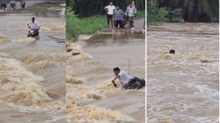 बारिश को लेकर मौसम विभाग ने येलो अलर्ट भी जारी किया हुआ है,अलर्ट के चलते प्रशासन ने नदी के किनारे तक जाने पर रोक लगाई हुई है बावजूद इसके लोग बाजार नहीं आ रहे हैं। लोग नदी के एनीकेट को पार कर जान जोखिम में डाल रहे हैं। यह वाक्या दुर्ग जिले के ग्राम सुरजीडीह का है जहां शिवनाथ पूरी तरह से उफान पर है अपने तट को छोड़कर बह रही है। ऊफनती शिवनाथ को पार करने का दुस्साहस करने वाला युवकअपनी बाइक लेकर आधे रास्ते तक पहुंचा लेकिन पानी का बहाव इतना तेज था कि युवक अनियंत्रित हो गया और नदी के बीचो-बीच खड़ा हो गया।देखते ही देखते कुछ देर के बाद उसका संतुलन बिगड़ा और तेज बहाव में बाइक सहित वह बह गया। हालांकि, युवक को तैरना आता था इसलिए वह थोड़ी दूर तक बहने के बाद वह तैरकर नदी से बाहर निकल आया।