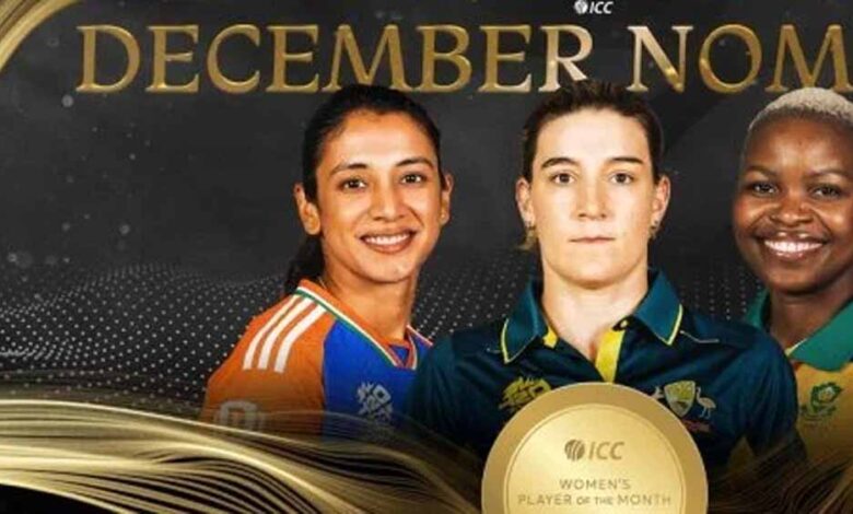 भारत की स्मृति मंधाना, ऑस्ट्रेलिया की एनाबेल सदरलैंड और दक्षिण अफ्रीका की नॉनकुलुलेको म्लाबा को आईसीसी दिसंबर की महिला खिलाड़ी के पुरस्कार के लिए नामांकित किया गया है। स्मृति मंधाना ने सभी प्रारूपों में असाधारण प्रदर्शन किया, भारत के दौरों और घरेलू श्रृंखलाओं के दौरान महत्वपूर्ण योगदान दिया। ऑस्ट्रेलिया के खिलाफ एकदिवसीय श्रृंखला में खराब शुरुआत के बावजूद, मंधाना ने तीसरे एकदिवसीय मैच में शानदार शतक (109 गेंदों पर 105 रन) के साथ वापसी की। इस पारी ने वेस्टइंडीज के खिलाफ बाद की घरेलू श्रृंखला में उनके प्रभावशाली प्रदर्शन के लिए मंच तैयार किया।