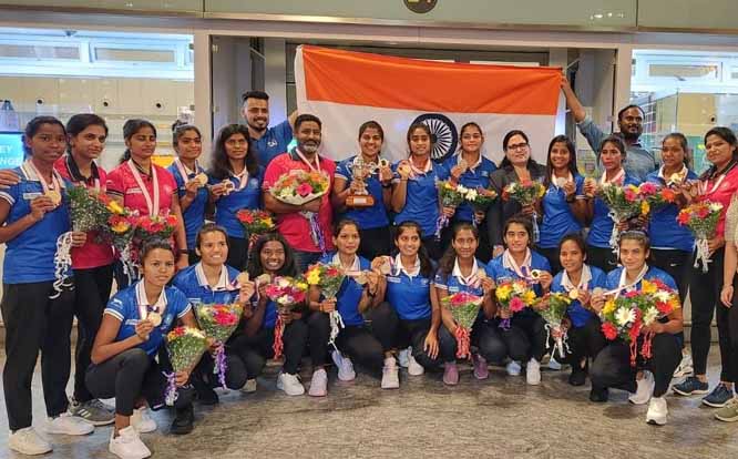 भारतीय जूनियर महिला हॉकी टीम का बेंगलुरू हवाई अड्डे पर हुआ जोरदार स्वागत