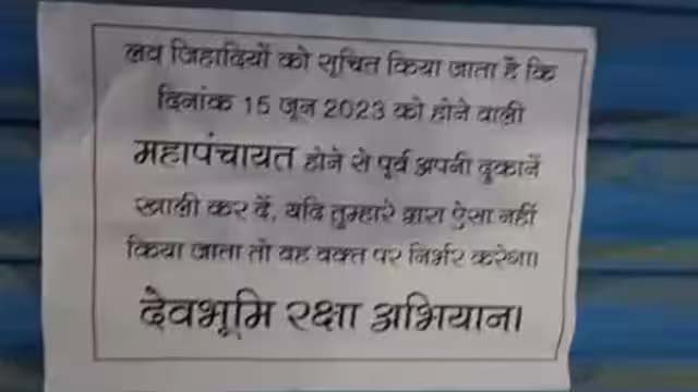 उत्तरकाशी के मेन मार्किट पुरोला में लगे पोस्टरों में मुस्लिम व्यापारियों से 15 जून को होने वाली महापंचायत से पहले अपनी दुकानें खाली करने को कहा गया है। देवभूमि रक्षा अभियान द्वारा लगाए गए पोस्टर में लिखा है, 'लव जिहादियों को सूचित किया जाता है कि दिनांक 15 जून, 2023 को होने वाली महापंचायत से पूर्व अपनी दुकानें खाली कर दें। यहि तुम्हारे द्वारा ऐसा नहीं किया जाता तो वक्त पर निर्भर करेगा।' पुलिस ने बताया कि 14 साल की लड़की के कथित अपहरण करने की कोशिश में एक 24 साल के स्थानीय दुकानदार उबेद खान और 24 साल के मोटरसाइकिल मैकेनिक जितेंदर सैनी को 27 मई को गिरफ्तार किया गया था। स्थानीय लोगों ने इसे लव जिहाद का मामला बताया है।