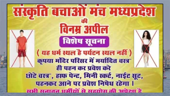 प्रदेश में कई मंदिरों के बाहर लगे पोस्टर चर्चा में हैं। इस पोस्टर में युवक-युवतियों को हिदायत दी गई है कि वो हाफ पैंट और मिनी स्कर्ट जैसे दूसरे कपड़े पहनकर मंदिर के अंदर प्रवेश ना करें। पोस्टर में कहा गया है कि मंदिर में श्रद्धालुओं के वेस्टर्न कपड़े पहनकर घुसने पर प्रतिबंध लगा दिया गया है। मंदिरों के बाहर और अंदर लगे इन पोस्टर के जरिए अपील की गई है कि श्रद्धालु असभ्य कपड़े नहीं बल्कि सभ्य कपड़े पहनकर ही मंदिर के अंदर प्रवेश करें। मध्य प्रदेश संस्कृति बचाओ मंच ने यह पोस्टर भोपाल के मंदिरों में लगाए हैं और वेस्टर्न यूनिफॉर्म में आने वाले श्रद्धालुओं के मंदिर में प्रवेश पर बैन लगा दिया है।