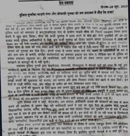 गौरतलब है कि माओवादियों ने सुकमा जिले के चिंतागुफा थाना क्षेत्र के ताड़मेटला ग्राम पंचायत के उपसरपंच माड़वी गंगा व यहां संचालित प्राथमिक शाला में पदस्थ शिक्षादूत कवासी सुक्का की बुधवार को हत्या कर दी गई थी। नक्सलियों ने जारी पर्चे में बताया कि जनअदालत में मार दिए गए उपसरपंच व शिक्षादूत वर्ष 2020 से बुरकापाल कैम्प प्रभारी के संपर्क में रहकर चुगली नेटवर्क के रूप में काम कर रहे थे। जनवरी 2021 में पुलिस को सूचना देकर ताड़मेटला निवासी माड़वी भीमा को निहत्थे पकड़कर निर्मम हत्या कराने के बाद दोनों भाग गए थे।