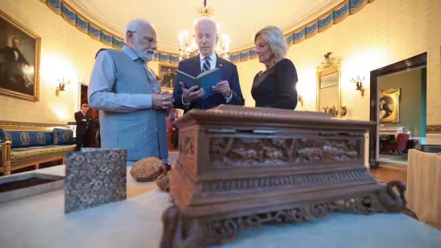 प्रधानमंत्री मोदी ने यूएस की फर्स्ट लेडी जिल बाइडेन को 7,5 कैरेट का ग्रीन डायमंड दिया है। उधर से जिल बाइडेन ने पीएम मोदी को 20वीं सदी की शुरुआत की एक हस्तनिर्मित अमेरिकी पुस्तक गैली भेंट की है। इसके अलावा राष्ट्रपति बाइडेन ने उन्हें विंटेज अमेरिकी कैमरा दिया। इसके अलावा उन्होंने पीएम मोदी को कलेक्टेड पोएम्स ऑफ रॉबर्ट फ्रॉस्ट की एक हस्ताक्षरित फर्स्ट एडिशन कॉपी उपहार में दी।