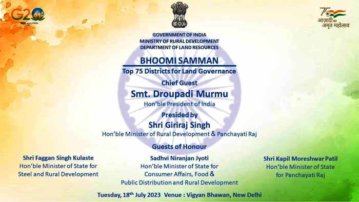 राष्ट्रपति द्रौपदी मुर्मू देश के 75 जिलों के कलेक्टरों के साथ मध्य प्रदेश के 15 जिलों के कलेक्टरों को नई दिल्ली मेंआज भूमि सम्मान से सम्मानित करेंगी। इन कलेक्टरों को डिजिटल इंडिया लैंड रिकॉर्ड्स मॉर्डनाइजेशन प्रोग्राम में बेस्ट परफारमेंस के लिए सम्मानित किया जाएगा। पिछले सालों में राजस्व विभाग की व्यवस्थाओं के अपडेशन को लेकर किए गए अच्छे कार्यों के चलते इन छोटे बड़े जिलों के कलेक्टर के सम्मानित किए जाने वाले हैं।