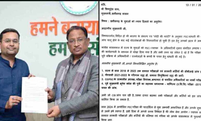 मुख्यमंत्री विष्णुदेव साय से मुलाकात कर भाजपा नेता उज्जवल दीपक ने ज्ञापन सौंपा और कांग्रेस शासन में हुए PSC घोटाले से संबंधित महत्वपूर्ण मांगे रखीं. उन्होंने पूर्व सीएम भूपेश बघेल पूर्व की बेटी के PSC द्वारा सहायक प्राध्यापक पद पर चयन की जांच CBI से कराने की मांग भी की है. मुख्यमंत्री उन्हें भरोसा दिलाया कि वो छत्तीसगढ़ के युवाओं के साथ किसी भी तरह का अन्याय नहीं होने देंगे.