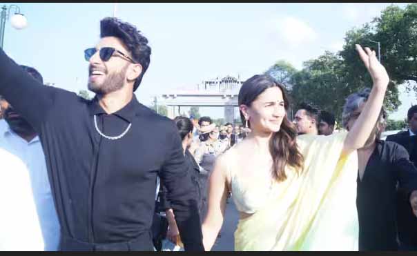बालीवुड अभिनेता रणवीर सिंह और अभिनेत्री आलिया भट्ट अपनी नयी फिल्म ‘रॉकी और रानी की प्रेम कहानी’ के प्रमोशन के सिलसिले में शनिवार को झुमका नगरी बरेली पहुंचे। परसाखेड़ा स्थित झुमका तिराहे पर अपने चेहते सितारों को देखने हजारों दर्शक पहुंचे। कार से उतरने के बाद दोनोने हाथ उठाकर अपने प्रशंसकों का अभिवादन किया और नयी फिल्म देखने की आग्रह किया।