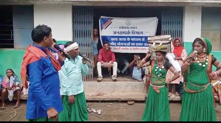 कोरबा जनसंपर्क संचालनालय एवं जिला जनसंपर्क कार्यालय कोरबा के सहयोग से स्पर्श सामाजिक एवं शैक्षणिक संस्थान रायपुर के कलाकारों द्वारा आदिवासी क्षेत्रों में राज्य शासन की जनकल्याणकारी योजनाओं के सफल क्रियान्वयन के लिए प्रचार प्रसार कर रहा है। इसी के तहत ग्राम पंचायत जामबहार, चुईया, अजगर बहार, धनगांव, तिलईडार, कछार, इसी प्रकार पोड़ी उपरोड़ा विकासखंड अंतर्गत पाथा, छींदमेर, लालपुर, माचाडोली, एलमा नगर, ओनाकोना, सहित विभिन्न ग्राम पंचायतों में शासन की जनकल्याणकारी योजनाओं का प्रचार प्रसार कर ज्ञानवर्धक जानकारियां लोगों तक पहुंचाई जा रही है।