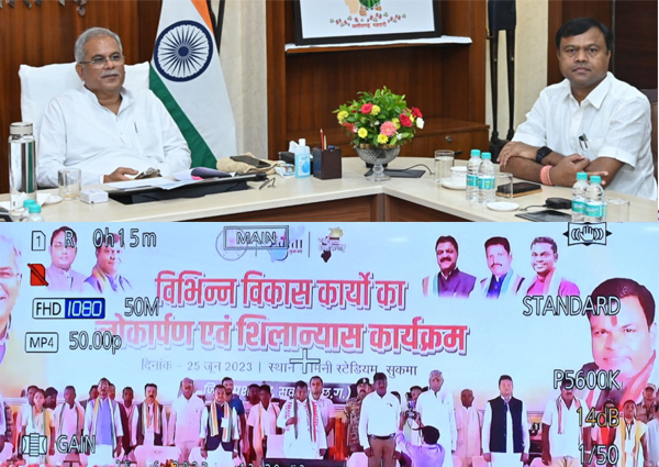 उल्लेखनीय है कि मुख्यमंत्री ने इस अवसर पर 303.67 करोड़ रूपए की लागत के 131 विकास एवं निर्माण कार्यों की सौगात दी, जिसमें 63 करोड़ 56 लाख 27 हजार रूपए की लागत वाले 33 विकास कार्यों का लोकार्पण तथा 240 करोड़ 10 लाख 81 हजार रूपए की लागत वाले 98 विकास एवं निर्माण कार्यों का शिलान्यास शामिल है। मुख्यमंत्री ने इस अवसर पर कहा कि वे प्रत्यक्ष रूप से लोगों से मिलना चाहते थे लेकिन तेज बारिश की वजह से संभव नहीं हो पाया, इस बात का खेद है लेकिन वर्चुअल रूप से आप लोगों से जुड़ पाया, इस बात का संतोष है। सबसे अच्छी बात यह है कि बारिश हो रही है और हमारे प्रदेश के लिए यह बहुत उपयोगी है। मुख्यमंत्री ने कहा कि भेंट मुलाकात के दौरान मंत्री कवासी लखमा ने सुकमा जिले में विकास कार्यों की जो मांगे रखी थीं, उन पर निर्णय लिये गये और अधोसंरचना की ठोस नींव यहां रखी गई है। आज शिक्षा, स्वास्थ्य, अधोसंरचना से संबंधित बड़े कार्यों का लोकार्पण-भूमिपूजन किया गया है। उन्होंने कहा कि बस्तर फाइटर्स की भर्ती हो या तेंदूपत्ता संग्राहकों के लिए उचित दर हो, सभी विषयों पर हम काम कर रहे हैं।