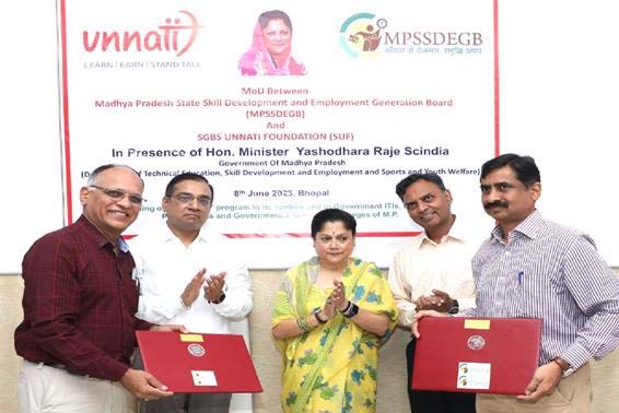 तकनीकी शिक्षा कौशल विकास एवं रोज़गार मंत्री श्रीमती यशोधरा राजे सिंधिया की उपस्थिति में मध्यप्रदेश राज्य कौशल विकास और रोज़गार निर्माण बोर्ड ने बेंगलुरू स्थित व्यावसायिक प्रशिक्षण और सामाजिक परिवर्तन फ़ाउंडेशन उन्नति संस्था के साथ 50 हज़ार युवाओं के रोज़गार कौशल प्रशिक्षण के लिए 3 साल से अधिक के लिए साझेदारी की है। संस्था प्रथम वर्ष में 15 हज़ार युवाओं को रोज़गार कौशल में प्रशिक्षित करेगी।