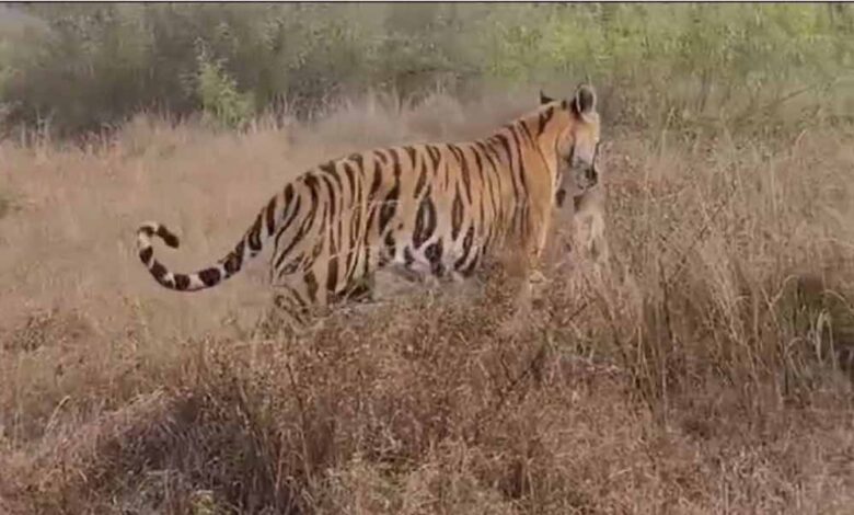 पर्यटकों ने बाघ पी-141 को एक हिरण का शिकार करते हुए देखा, पर्यटकों ने इस रोमांचित पल को किया कैद