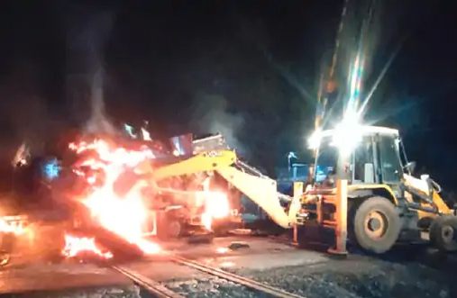 रेलवे क्रॉसिंग पर OHE लाइन के संपर्क में आने से पर ट्रक में लगी भीषण आग
